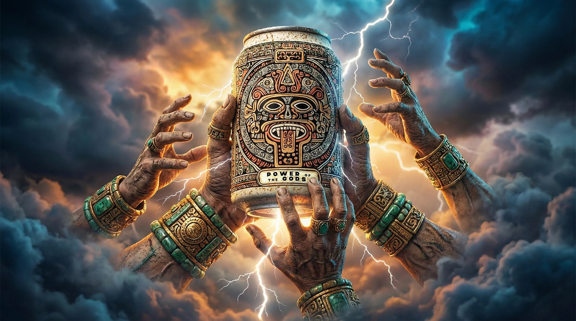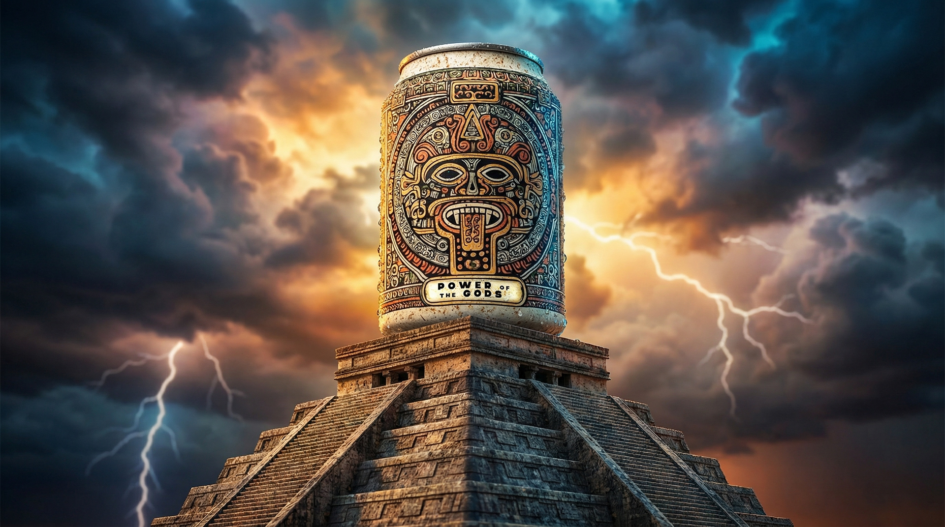 A fully self-created design and a generated video commercial for an energy drink in Aztec-inspired style. AI-directed art, as well as all video and audio editing, were created from scratch